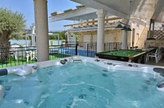 צמודה אל הווילה חצר נופש מושקעת ומטופחת עם בריכת שחייה מחוממת ומקורה בעונה, ג'קוזי זרמים מפנק, פינות ישיבה ושיזוף, שולחן סנוקר, שולחן פינג פונג, עמדת מנגל.