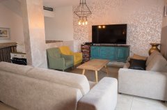 הסלון בקומת הקרקע:מערכת ישיבה ומסך טלוויזיה.